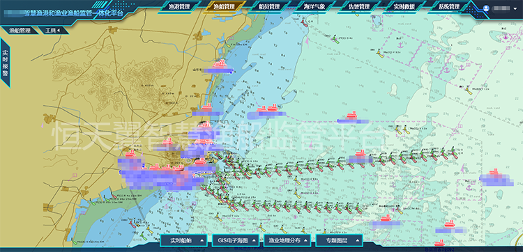 1.渔船动态监控系统:整合渔船动态传感设备信息,完成渔船动态实时控制和各种信号的整合联动分析,完成重点船舶和重点区域的实时动态监控。集成船舶通信设备,完成渔船的通信。完成渔船出入境政策精准研判、身份信息核对、重点区域跨境政策研判和报警。