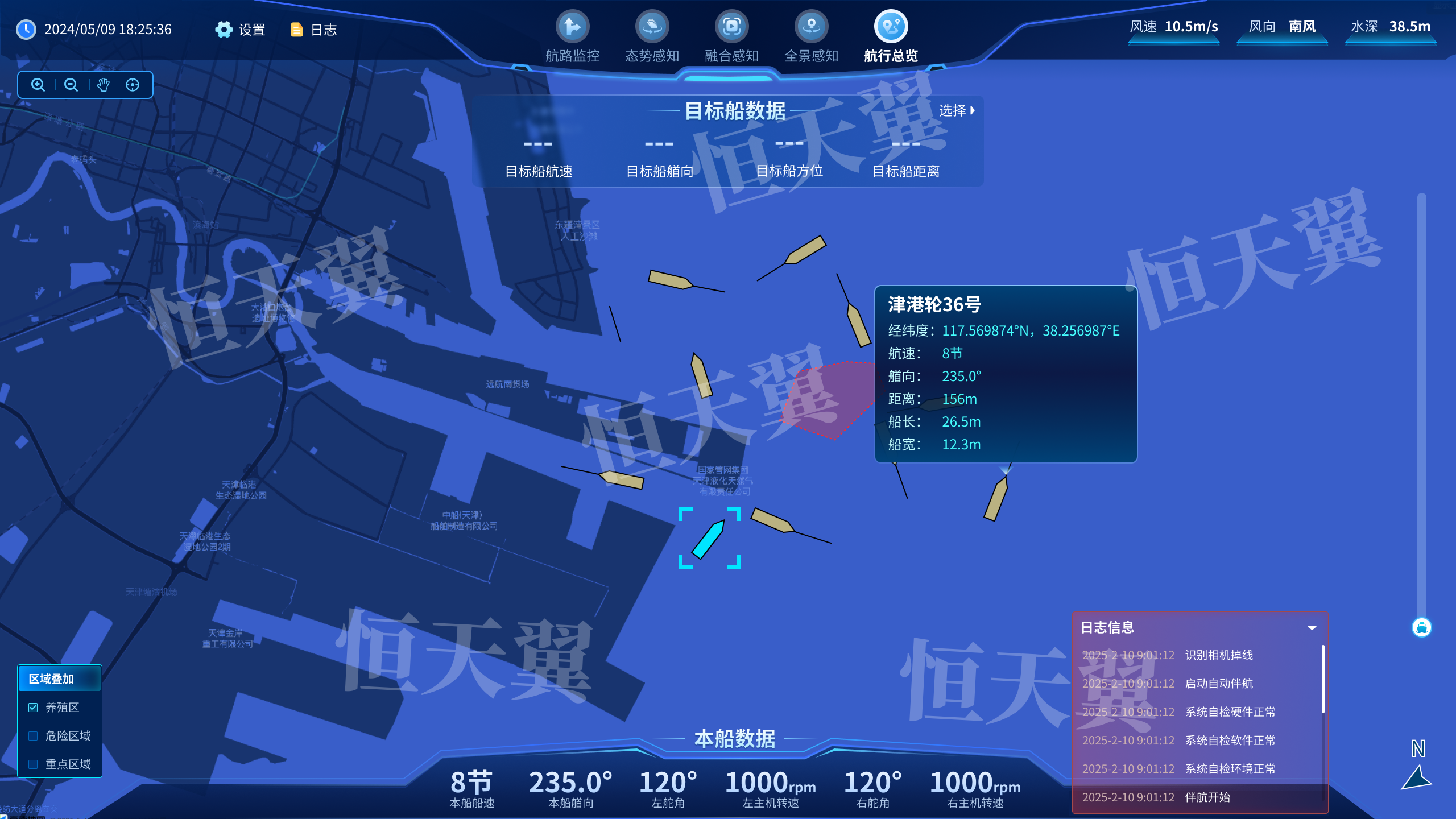3. 周边设备感知:通过AIS船舶自动识别系统以及RS24雷达,在电子海图上感知显示出伴航船舶周边的所有船舶位置,为下一步选择目标船舶提供准备。同时获取到船的静态信息如船名、呼号、吃水等静态信息,以及航速、航向等动态信息。